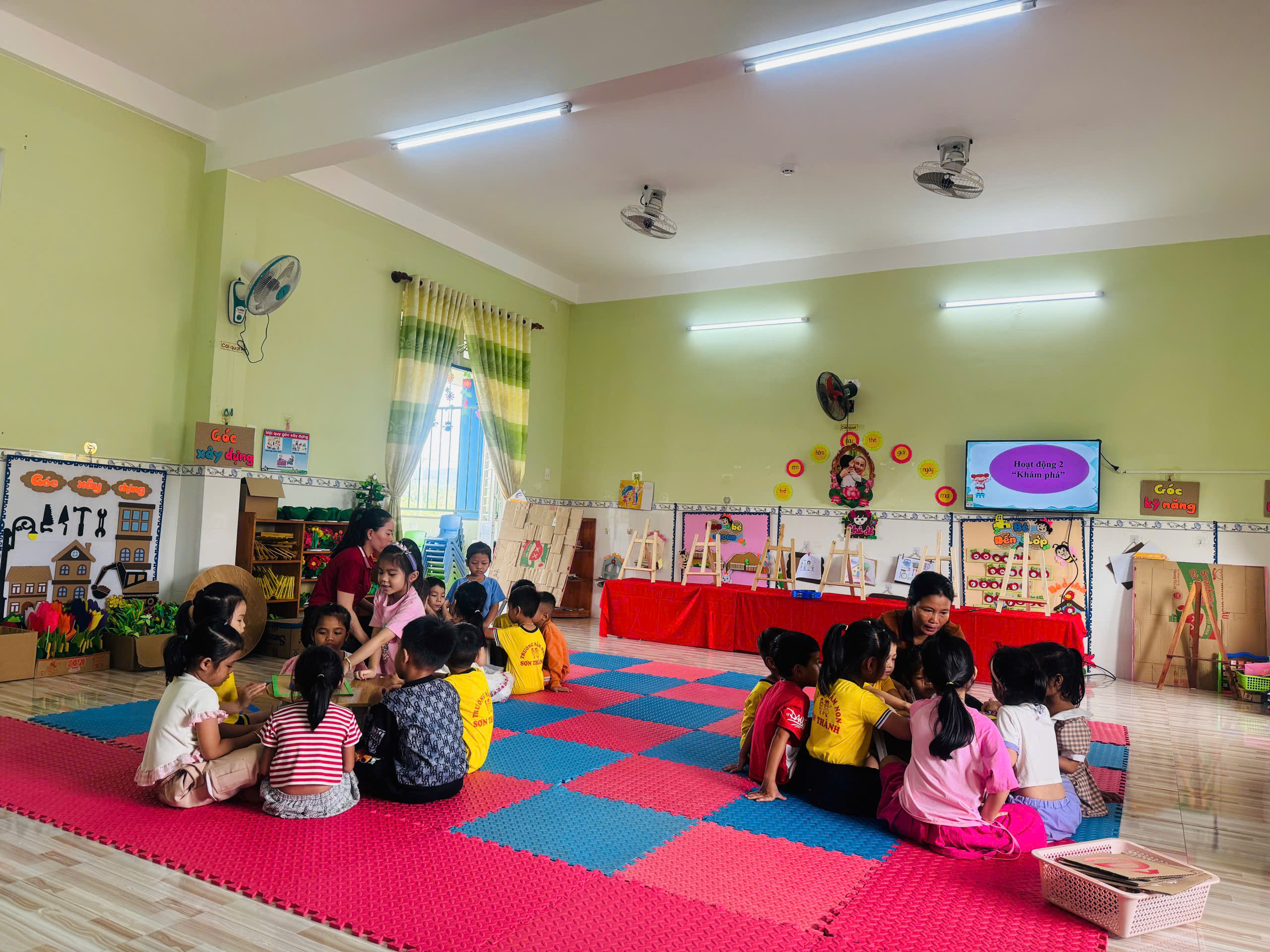 Các bé tham gia nhiều hoạt động phong phú như: xem tranh – thẻ chữ, tìm chữ trong hình, tô và ghép chữ, tạo hình chữ bằng que – hột hạt. Nhờ cách tổ chức sinh động của cô giáo, trẻ hào hứng, mạnh dạn phát biểu và nắm bài rất nhanh.